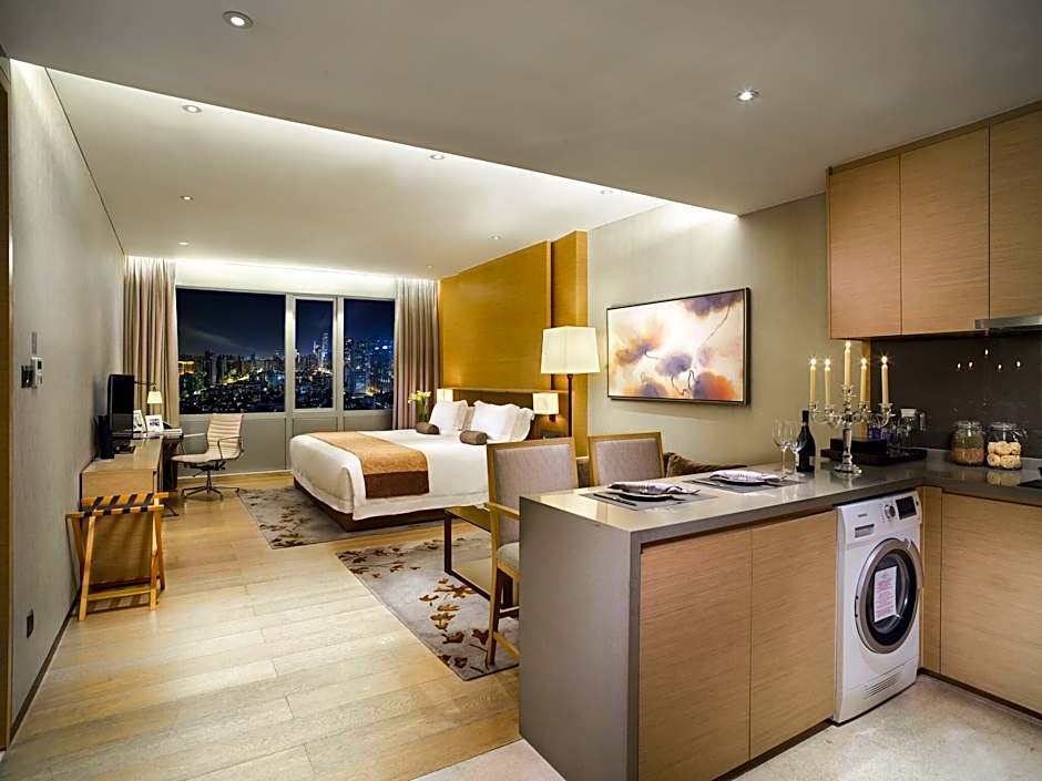 The studio is 43 square yards and comes with a washing machine, a well-equipped kitchen.